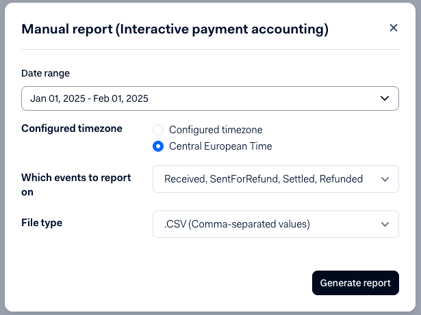 - Interaktiver Zahlungsabrechnungsbericht: Mit dieser Version können Sie manuell einen benutzerdefinierten Zahlungsabrechnungsbericht für einen bestimmten Datumsbereich und eine bestimmte Zeitzone (unsere Rechnung wird in der Zeitzone AMS ausgestellt) mit vorgefilterten Zahlungsereignissen erstellen. Damit ist diese Version ideal für manuelle, einmalige Abstimmungen.