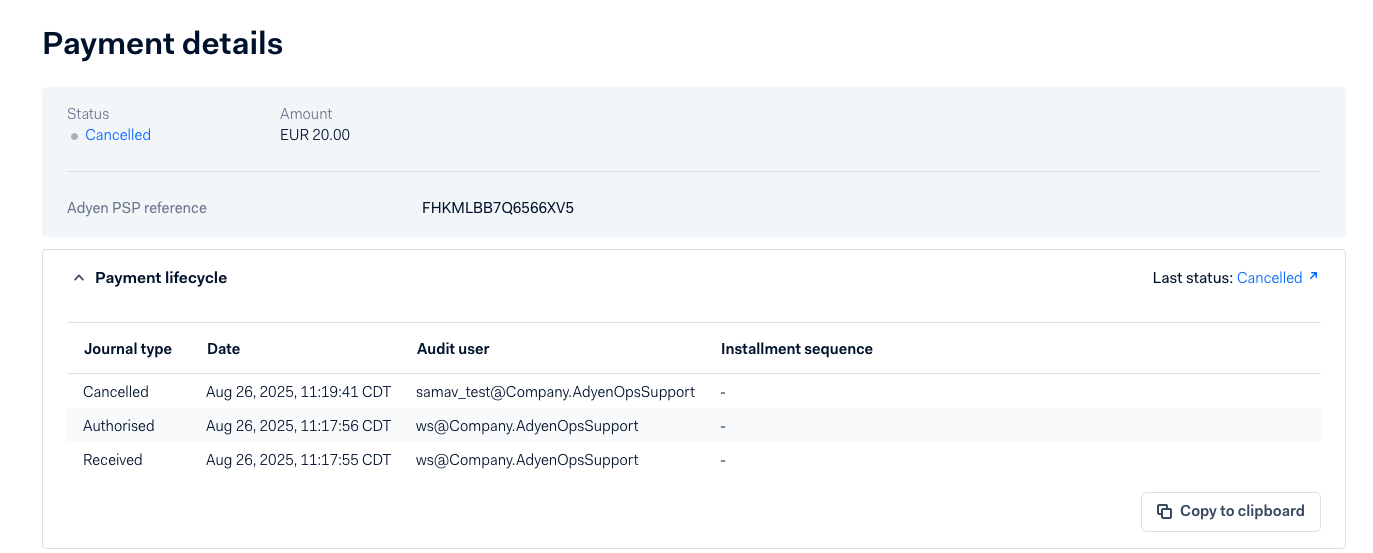 Une fois qu'une transaction a Ă©tĂ© annulĂ©e, il n'y a plus de retenues d'autorisation en attente du cĂ´tĂ© d'Adyen.Â