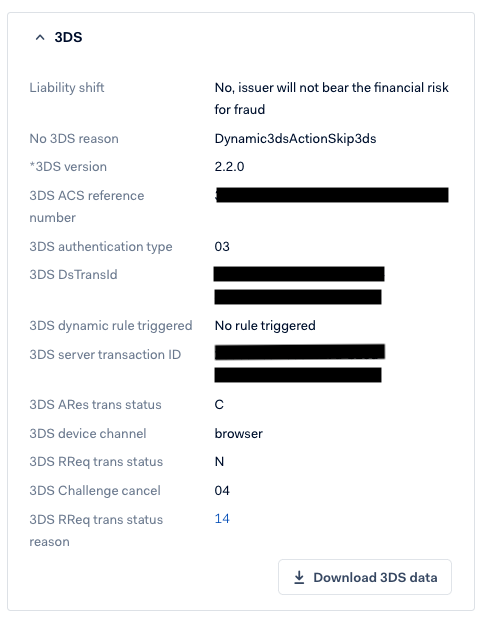 transStatusReason、ChallengeCancel、およびCardHolderInfoは、3DSのトラブルシューティング時に注意すべき値です。上記のハイライトされたリンクには、可能な値がすべて記載されています。